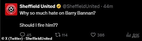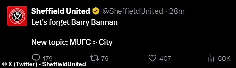 《邮报》消息称,本周一,谢菲联官方社交媒体账号遭到了黑客入侵。当日,账号发布了一条颇具争议性的动态,内容涉及到球队队长巴里-班南,引发了球迷和观众们的热议。动态内容包括疑似调侃班南的话语以及一张班南的特写照片,随后又试图将话题转移到曼联和曼城。